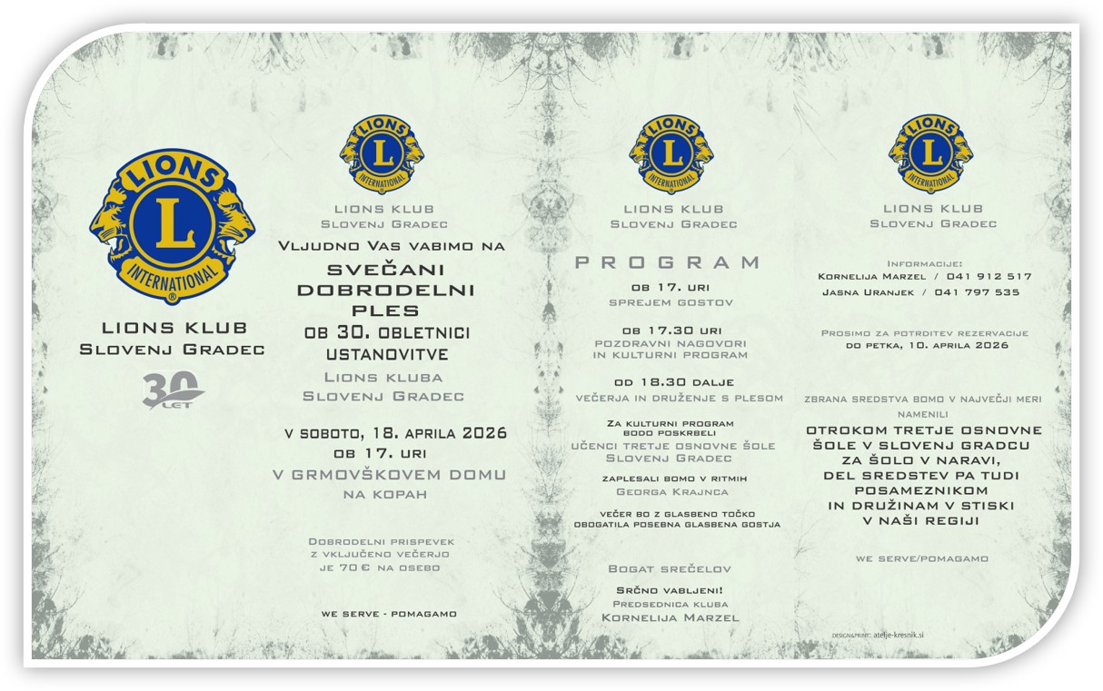 Svečani dobrodelni ples ob 30. obletnici ustanovitve Lions kluba Slovenj Gradec bo v soboto, 18. aprila 2026, ob 17. uri v Grmovškovem domu na Kopah.